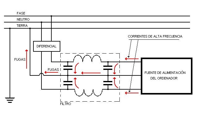Primera: Los PC’S están construidos de tal forma que sus fuentes de alimentación son conmutadas, funcionan de tal manera que primero rectifican la corriente alterna y luego la ondulan (la vuelven a convertir en alterna) a una mayor frecuencia. El objeto de elevarla de frecuencia es poder transformarla, reducirla en tensión, con transformadores de núcleo magnético más pequeño y por tanto menos pesados, voluminosos y caros. Una vez transformada la rectifican y la hacen contínua para alimentar a los circuitos electrónicos internos. El proceso de ondulación hace que dentro de la fuente se obtengan componentes de frecuencias elevadas (comparadas con los 50 hertzios de la red). Parte de estas señales alternas podrían ser inyectadas en la red eléctrica, lo que no permite la normativa actual. Para evitar esta inyección de alterna residual, de alta frecuencia los fabricantes de fuentes colocan un filtro en la entrada que las deriva a tierra, es decir, no salen a la fase y el neutro pero salen por el cable de tierra. Lo que provoca un desequilibrio diferencial. Existe, además, un efecto acumulativo debido a las pérdidas que se producen en el filtrado de la corriente pulsante para convertirla en continua, este circuito también produce pequeñas derivaciones a tierra (ver figura siguiente).