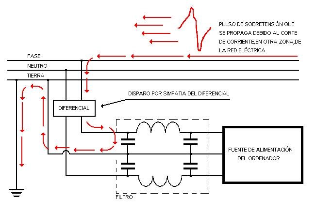 Supongamos que en algún sitio alguien está consumiendo mucha energía eléctrica, en un momento determinado (un laboratorio tiene muchos ordenadores encendidos -0,5 amperios por ordenador- 10 ordenadores hacen 5 Amperios; además estamos en un entorno eléctrico que pertenece a un polígono industrial con mucha maquinaria, motores eléctricos, iluminación fluorescente…etc). Si se le produce un corte brusco de alimentación a ese supuesto consumidor de corriente eléctrica, por efecto inductivo de las líneas de alimentación, se generará una sobretensión, un pico de tensión de duración muy corta, que se propaga y es derivado a tierra en forma de corriente por las capacidades de las fuentes de alimentación de los PC’S y por las capacidades distribuidas entre las líneas de fase y neutro y tierra. El efecto es un posible disparo fortuito de un diferencial sin causa aparente, o lo denominado disparo por simpatía: salta el diferencial del laboratorio A y arrastra en su salto al del laboratorio B.
