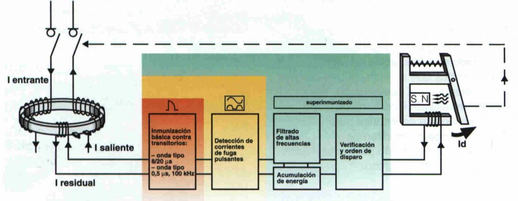 En la figura se observa que la corriente alterna circula entre la fase y el neutro, la misma intensidad debe entrar que salir por el circuito. El interruptor diferencial lleva una bobina con un núcleo de un material magnético de alta coercitividad, por cuyo interior circulan la fase y el neutro. La suma vectorial de la corriente entrante más la saliente de la bobina debe dar cero de resultante. Si por alguna razón en el circuito protegido alguien tocase un cable y se produjese una derivación a tierra (por ejemplo a través del cuerpo de una persona), de más de 30 miliamperios, la resultante de la suma vectorial de la corriente de entrada y salida sería distinta, pues hay una pequeña componente de intensidad que no vuelve y por tanto no circula por el núcleo del toroide. En este caso se induciría una corriente en la bobina que crea un campo magnético en el imán que se opone al propio del imán permanente que sujeta la armadura. Cuando la intensidad del imán permanente es disminuida lo suficiente para que se suelte la armadura, ésta desenclava mecánicamente el interruptor bipolar cortando la corriente de una forma casi instantánea.